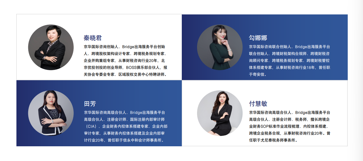 公司旗下有京华国际咨询、企业出海生态联盟、Bridge出海服务平台、京华研学社、超级财税人联盟五大品牌,为企业提供企业出海财税顾问、海外投资架构设计、ODI境外投资备案、海外公司注册、境内财税顾问、企业并购重组、企业分立、企业内控体系建设、共享CFO、上市辅导、股权设计等一站式咨询服务。